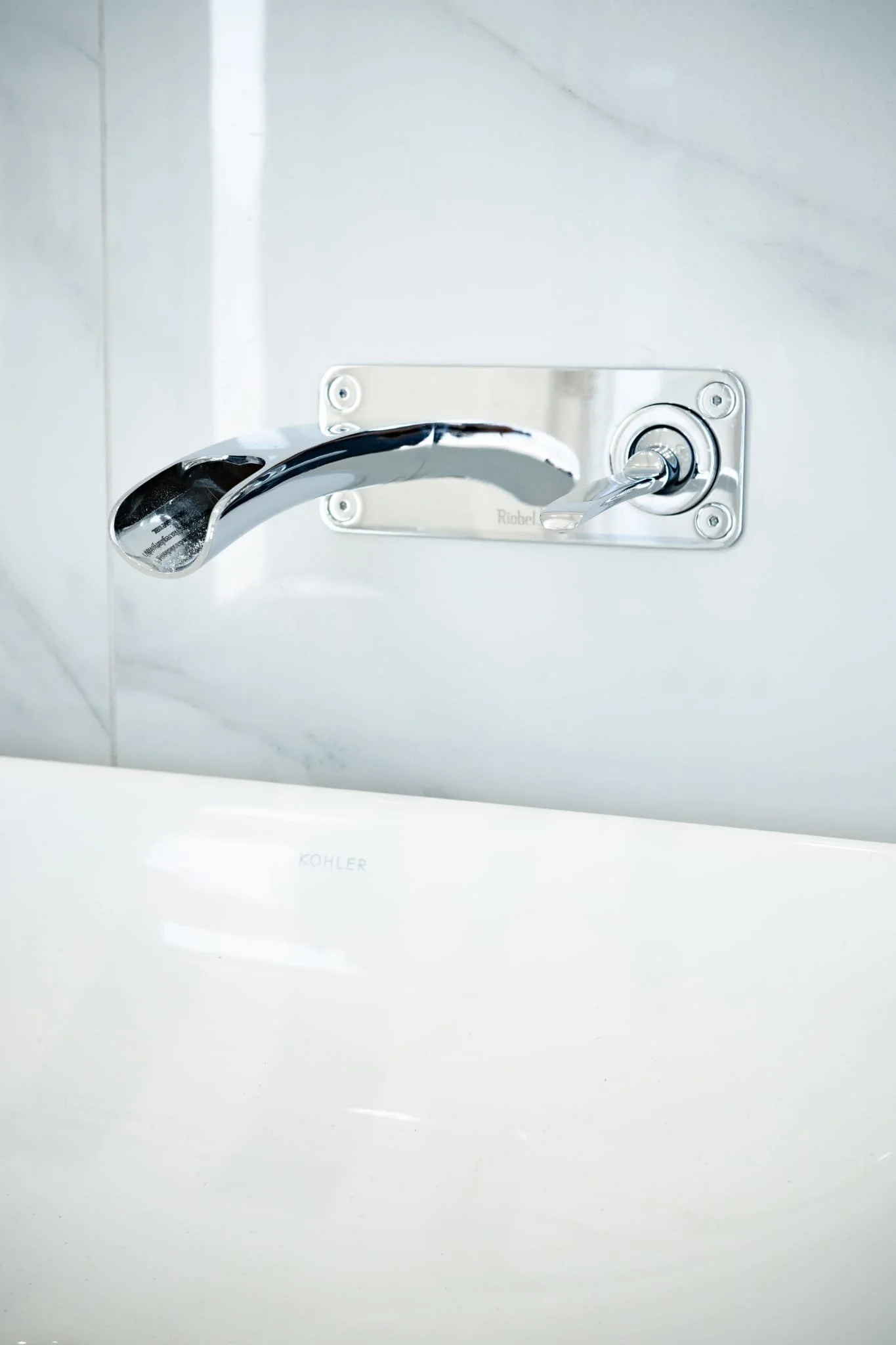 Close-up of a chrome bathroom faucet with a lever handle, mounted on a white wall.
