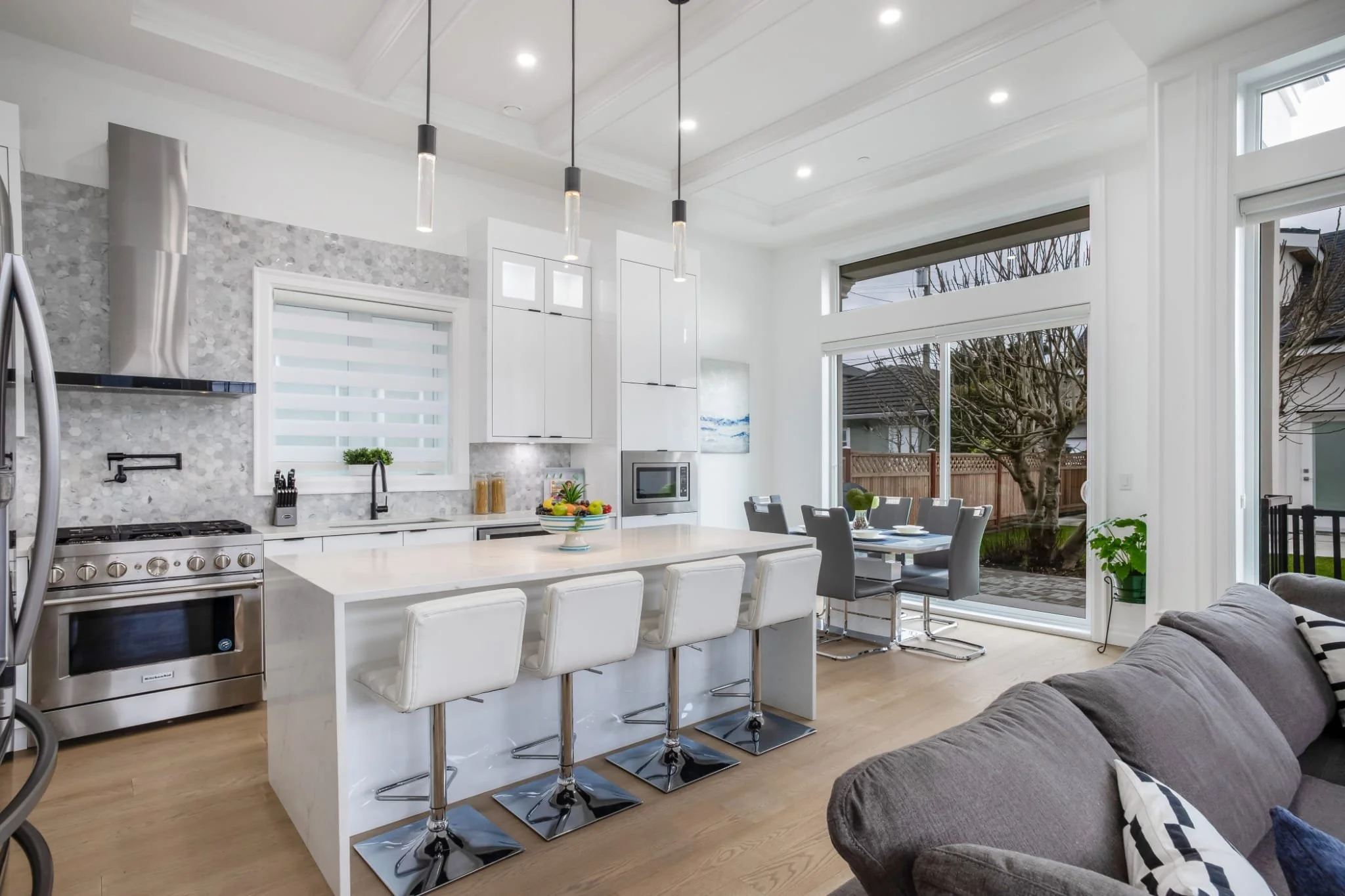 Bright, modern kitchen with white cabinets, marble backsplash, stainless steel appliances, and a large island with four white chairs. Adjacent dining area with a grey table and six chairs. Large windows and sliding glass door providing natural light,